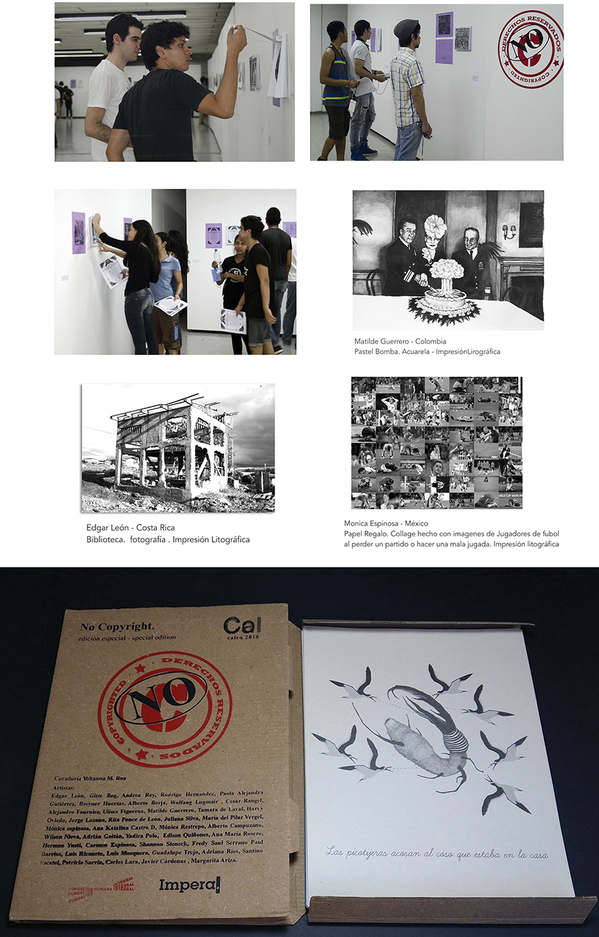 La exposición No Copyright propuso una postura poco tradicional del concepto de “copia”: pretende agudizar la percepción de lo cotidiano, capturado por el ojo del artista, resignificando el valor de una imagen y su copia en los tiempos digitales del “Copy&Paste”, la impresora casera y la fotocopia; En donde una “pequeña o breve” acción sobre dichos fragmentos, construye una imagen cargada de un concepto que devela lo trascendente de lo intrascendente, sin la obligación de producir una imagen grandilocuente.